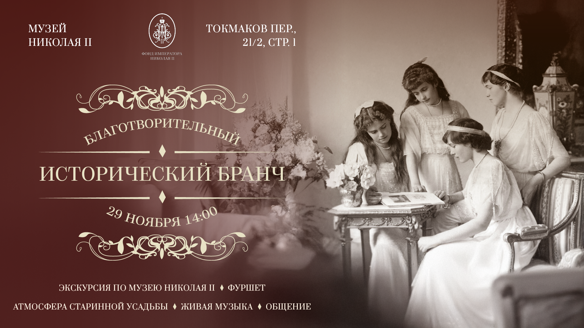 Фонд Императора Николая II имеет честь пригласить Вас на БЛАГОТОВОРИТЕЛЬНЫЙ ИСТОРИЧЕСКИЙ БРАНЧ, который состоиться 29 ноября в усадьбе Струйских-Белавиных-Варенцовых по адресу Токмаков пер., д. 21/2, стр.1.